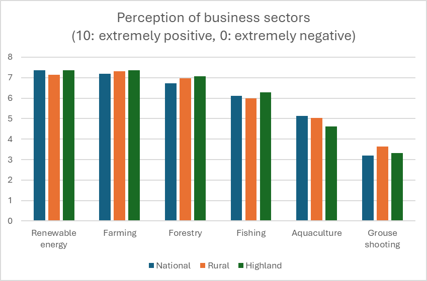 The second point is what I see is a very likely link between perceptions of these sectors and their environmental impact. Renewable energy is viewed positively by all samples, while the sectors viewed least positively – aquaculture and grouse shooting – are those with the most obvious environmental concerns.